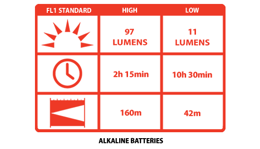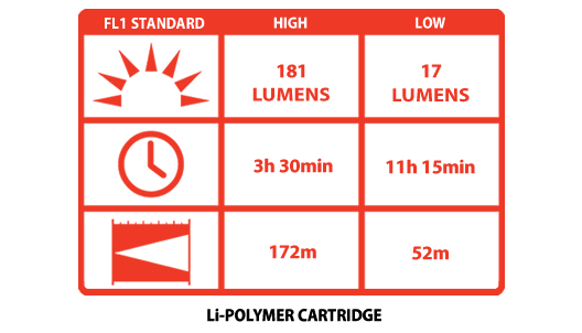 | Мощност (ANSI FL1) | 181 / 17 lm (Li-Po) ••• 97 / 11 lm (alkaline) |
